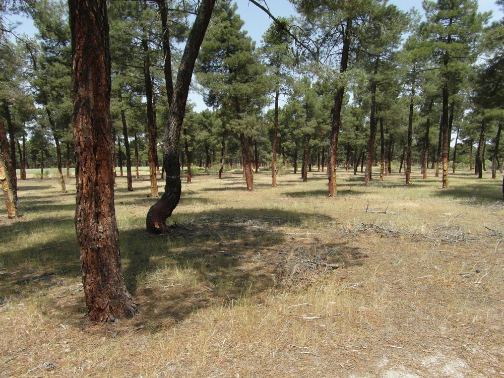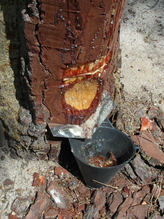 Al snel liep ik in een dennenbos. Hier werd van de bomen de hars afgetapt en het rook uitstekend. Het werd allengs wel warmer en er kwam een beetje sluierbewolking.