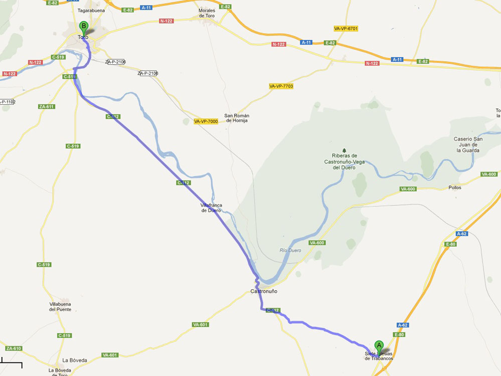 Daarna verder. Het eerste deel van de routebeschrijving het dorp uit klopte aardig. Daarna hield het op. Na ongeveer ½-¾ uur kwamen we weer op hetzelfde punt uit. Stukje naar de weg teruggelopen en gevraagd hoe nu verder. Een aardige vrouw wilde ons wel weer op het spoor zetten (maar pas na ca 10 minuten, want ze wilde zich eerst omkleden); wel erg aardig. Zij bracht ons overigens naar de andere kant van het dorp naar de rio Duero. Dat was niet geheel onze route, maar we konden daar wel een prachtig pad langs de rivier volgen (Camino Levante). Na een tijdje boog het wat verder van de rivier af en kwamen we weer in de buurt van de weg. Bij een stuw in de rivier was het nog ca 5 km naar Villafranca. Een minimaal dorp waar we wat gegeten en gedronken hebben. Maar er ging geen bus naar Toro. Gebeld voor een taxi en die zou er over een uurtje kunnen zijn. Cath wachtte op de taxi en ging verder voor de resterende 15 km, zonder andere onderbrekingen onderweg naar Toro.