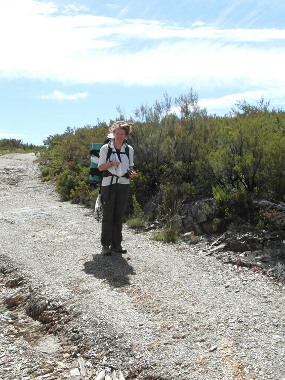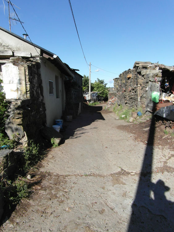 Eerste rust bij de varkens, dat wil zeggen, aan de kant bij een boerenstal met varkens kon ik ergens op een paar stenen zitten. Even op Cath gewacht; die liep goed en liep dus meteen door.