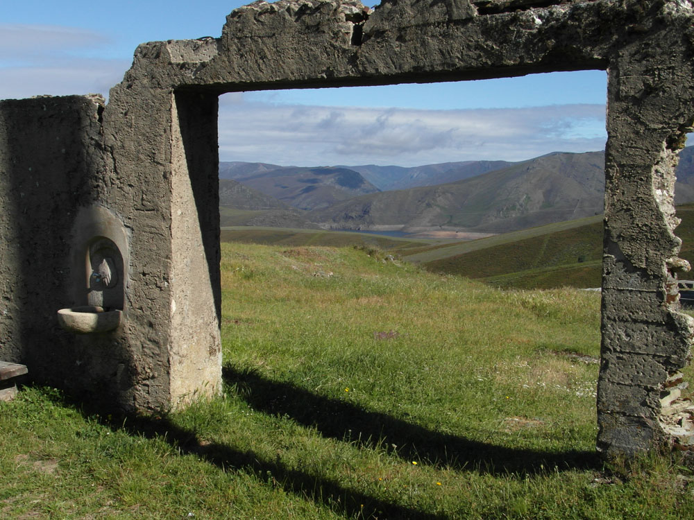 Via Venta Teresa naar Venta Bolaño. Wat gegeten en gedronken. Door de "poort" duidelijk zichtbaar dat er aanmerkelijk minder water in het stuwmeer stond dan vorig jaar. Cath kwam er aan en ook Monika.