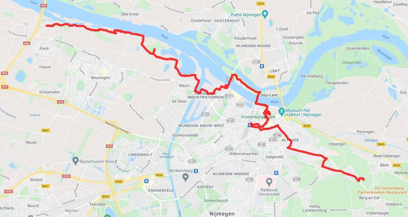 De route die we hebben gevolgd. Door omstandigheden zijn we de tweede dag niet door het "Reichwald" gelopen