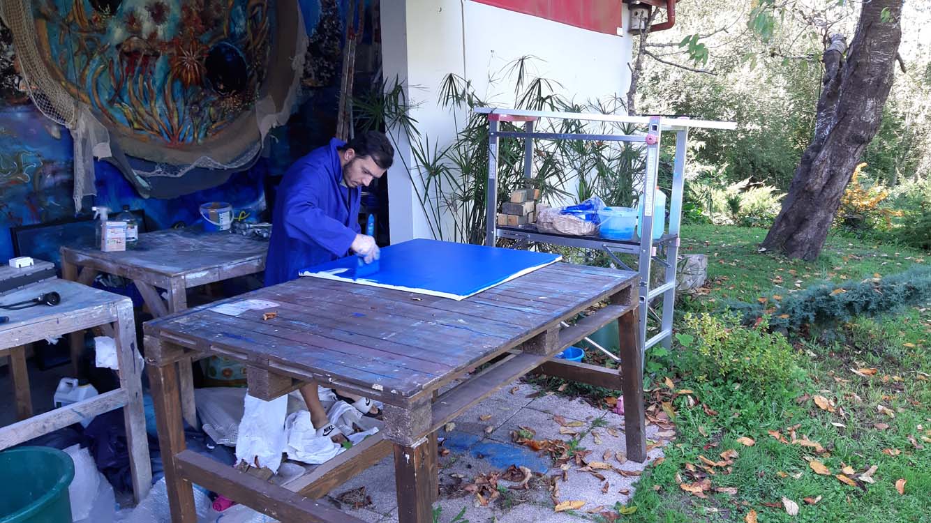 Het dorpje was groter dan ik me had voorgesteld. Andy le Bleu is een schilder met een groot huis (chambre d’hôte) met daarin veel blauwe kunst en een permanente expositie en best veel kijkers/ kopers in de korte tijd dat ik even in de tuin zat bij te komen van de warmte van de reis.