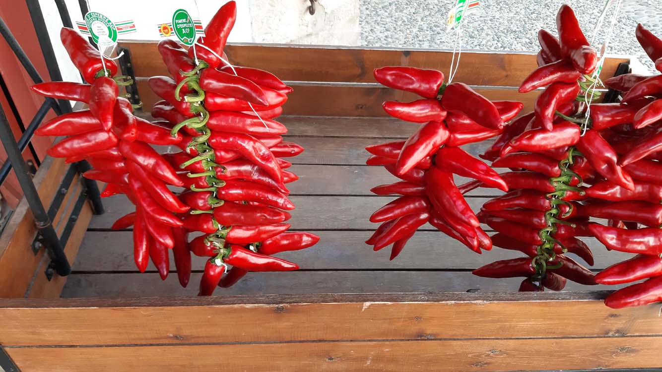 Om een uur of 2 in Espelette. In de omgeving werd veel peper verbouwd en het dorp was een “peperdorp”. Overal pepers. Aan de muren in het plaatsje, in de winkels, op de markt, waar je ook keek. Met veel toeristen om peper te kopen en/ of te fotograferen.