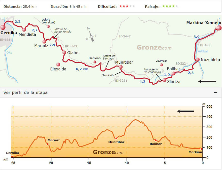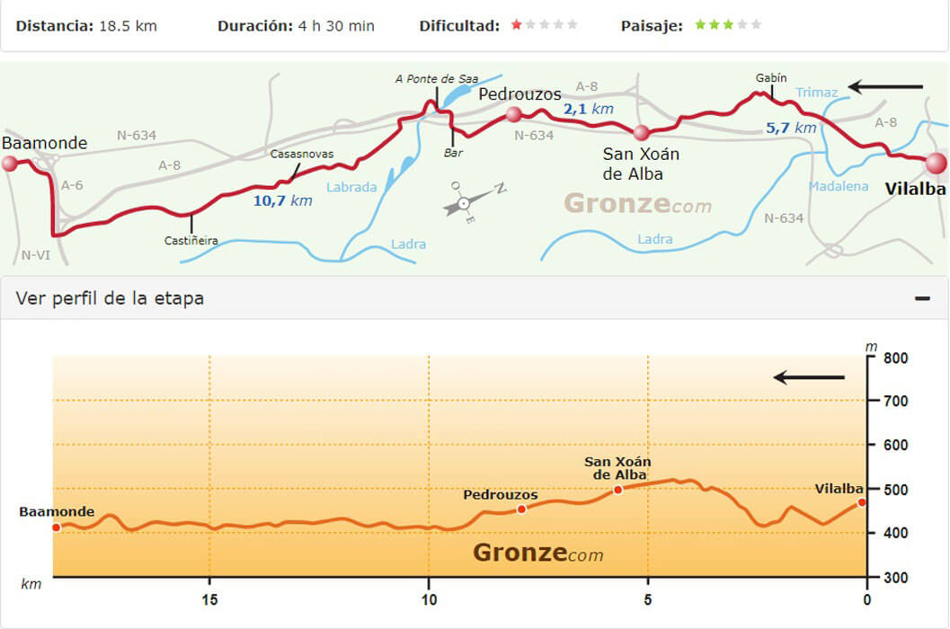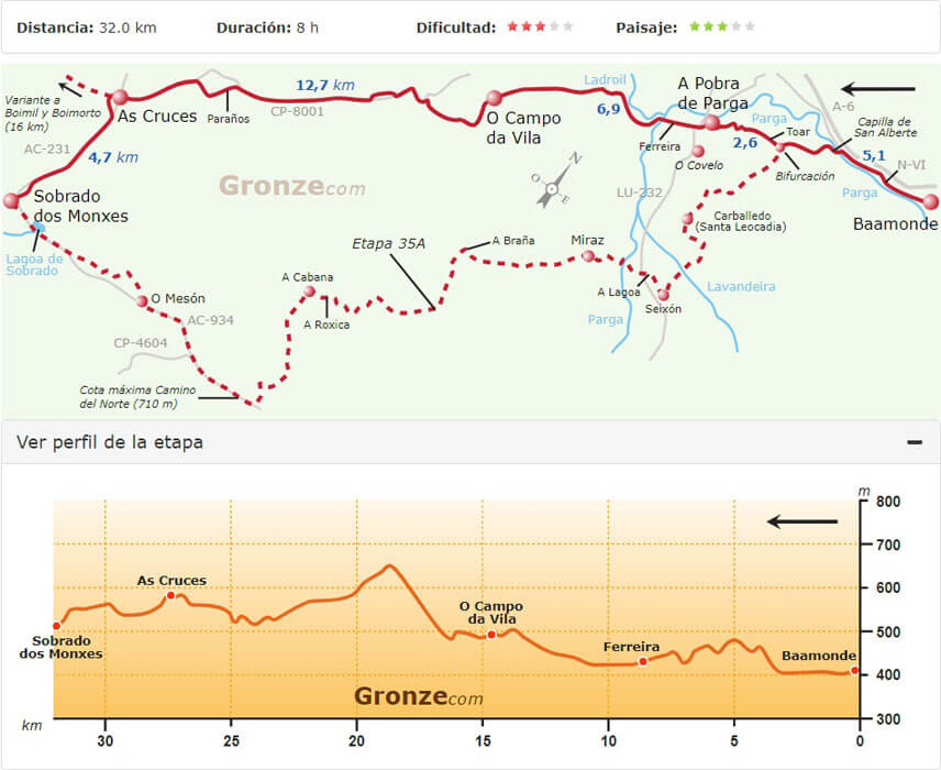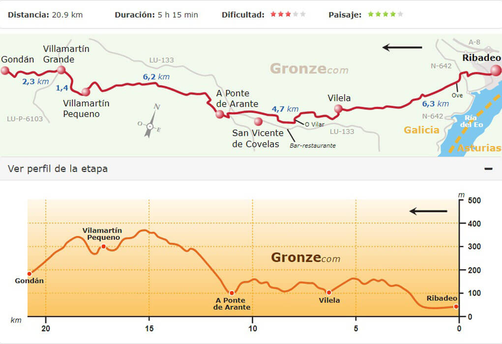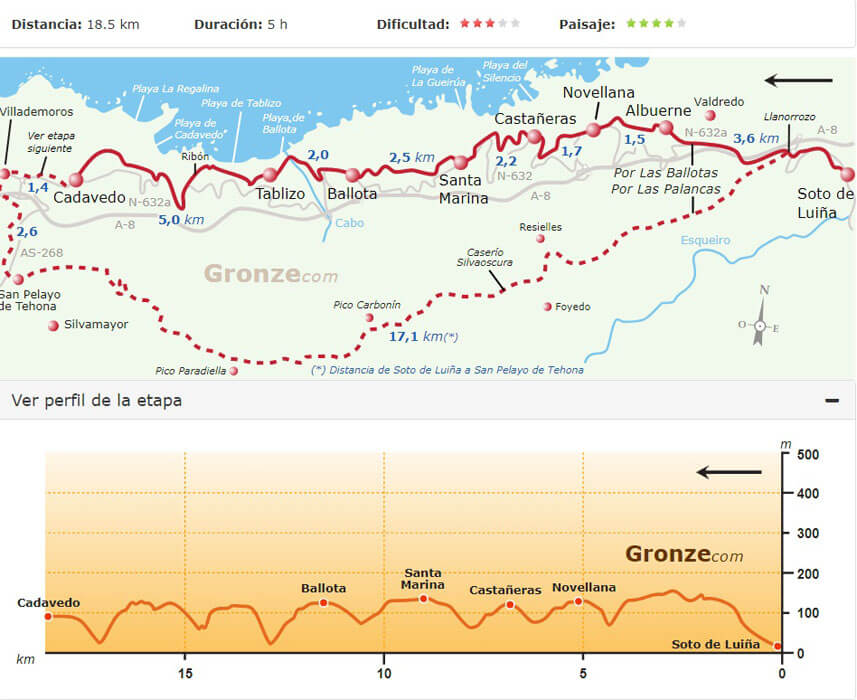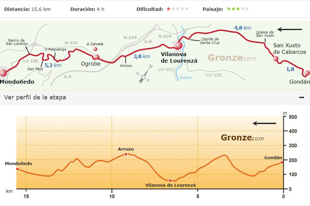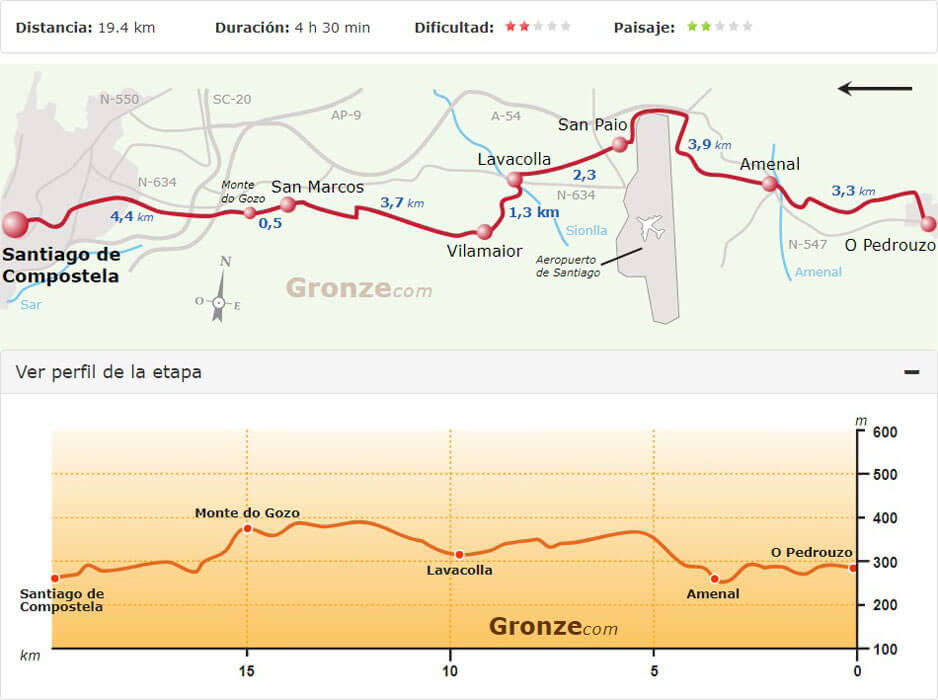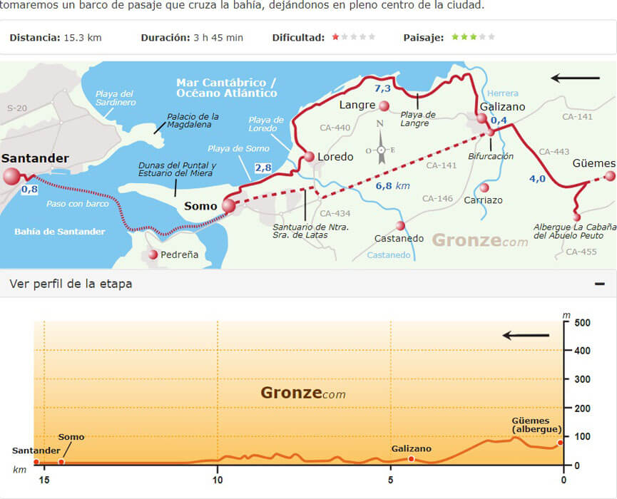 Van Gronze.com had ik nog route- en hoogtekaartjes van de tocht, zodat we aan de hand van de kaartjes de te lopen afstanden konden bepalen.