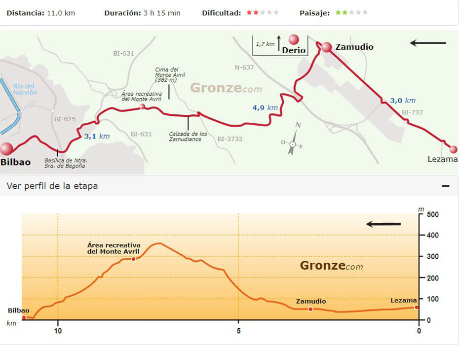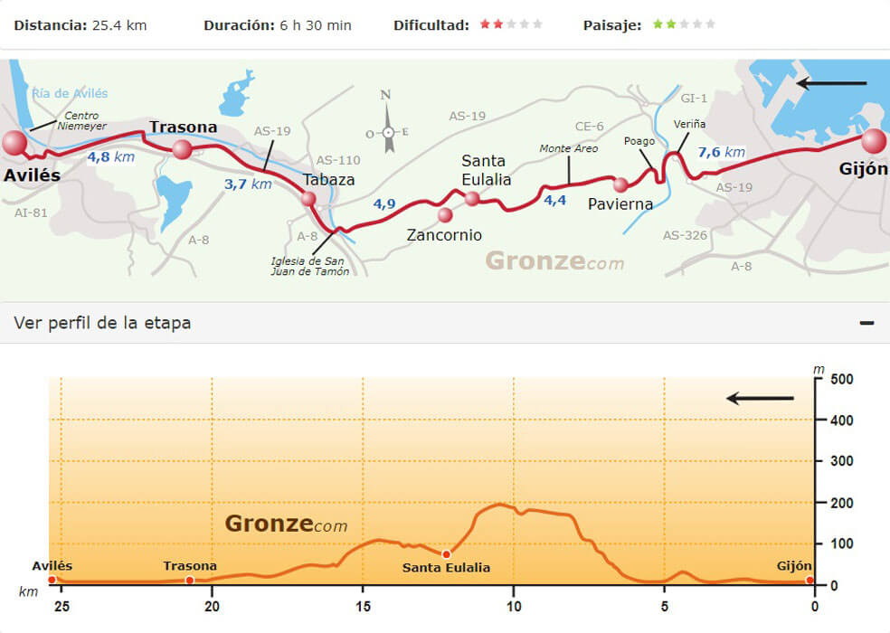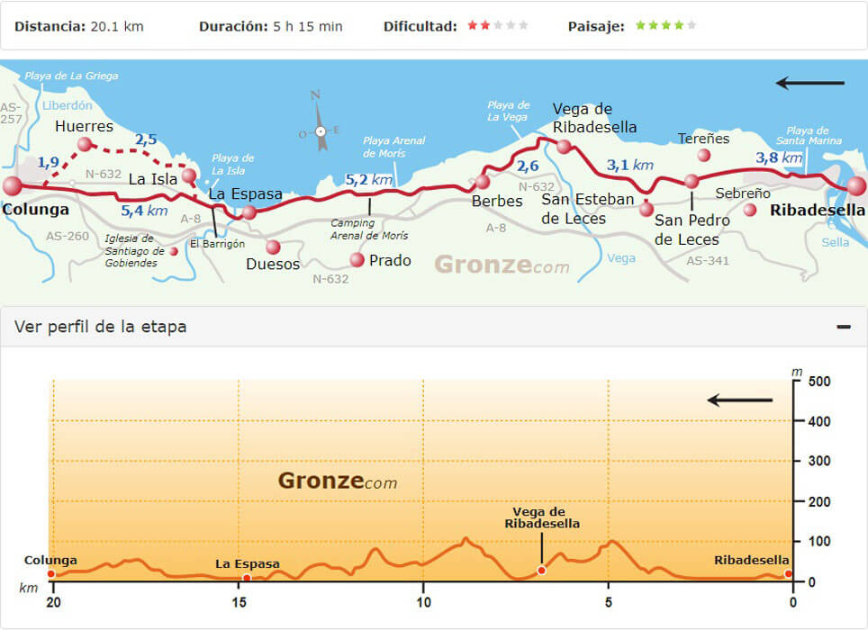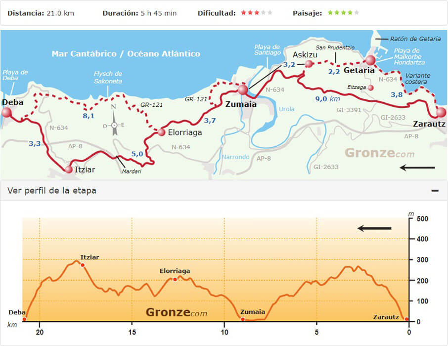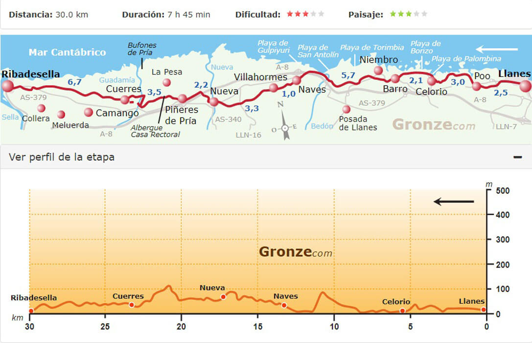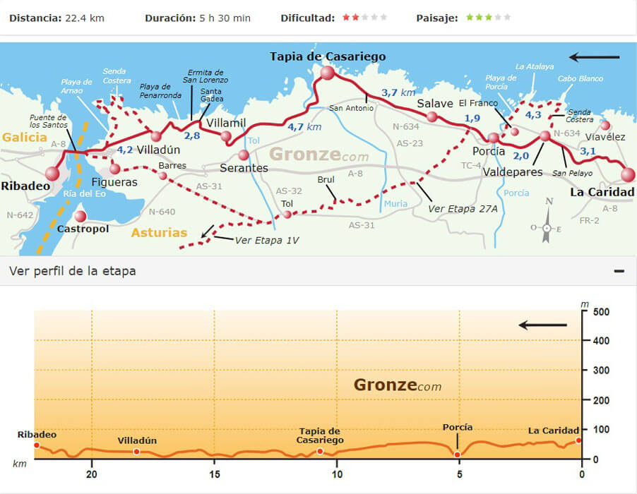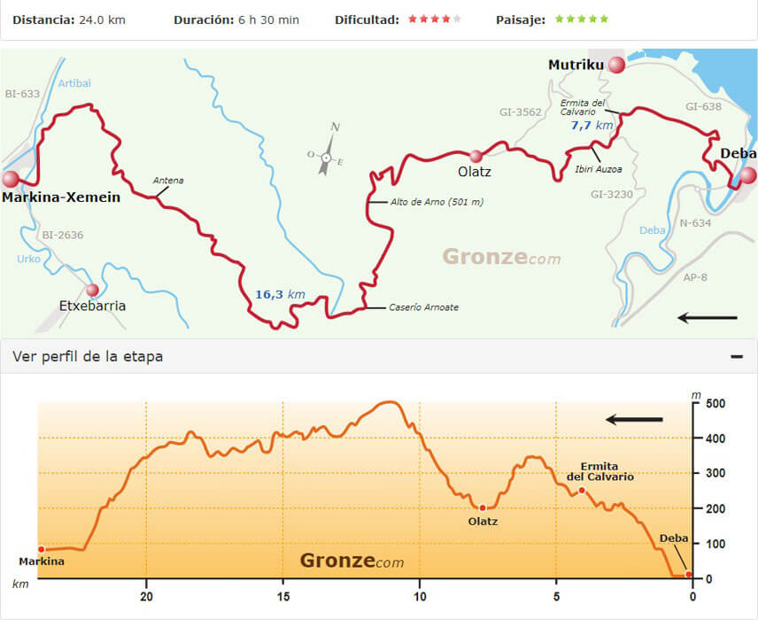 Van Gronze.com had ik nog route- en hoogtekaartjes van de tocht, zodat we aan de hand van de kaartjes de te lopen afstanden konden bepalen.